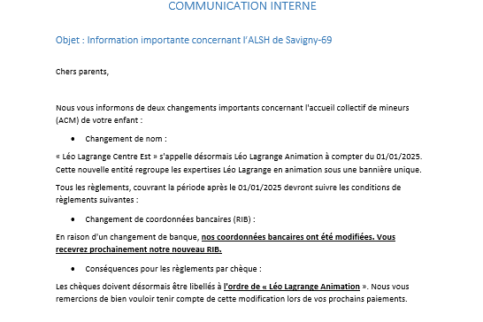 Nouveau RIB pour vos règlements par virement Accueil de loisirsPar Léo Lagrange Savigny16 janvier 2026 Lire la suite
